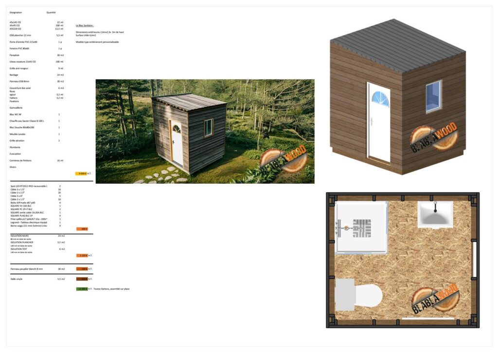 Modèle type entièrement personnalisable, dimensions extérieures 2,6×2,3x3m de haut, Surface utile de 4,6m2, à partir de 9600 € H.T.